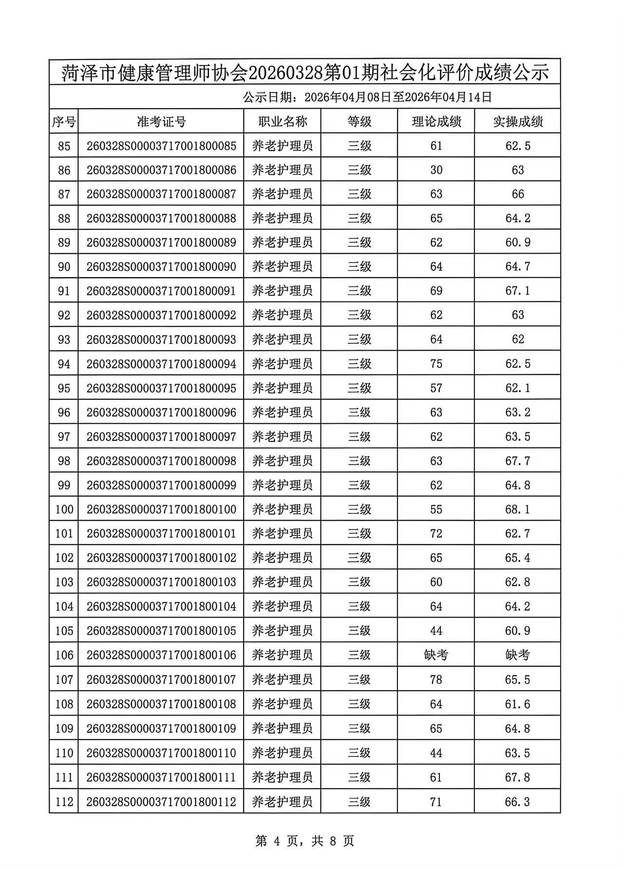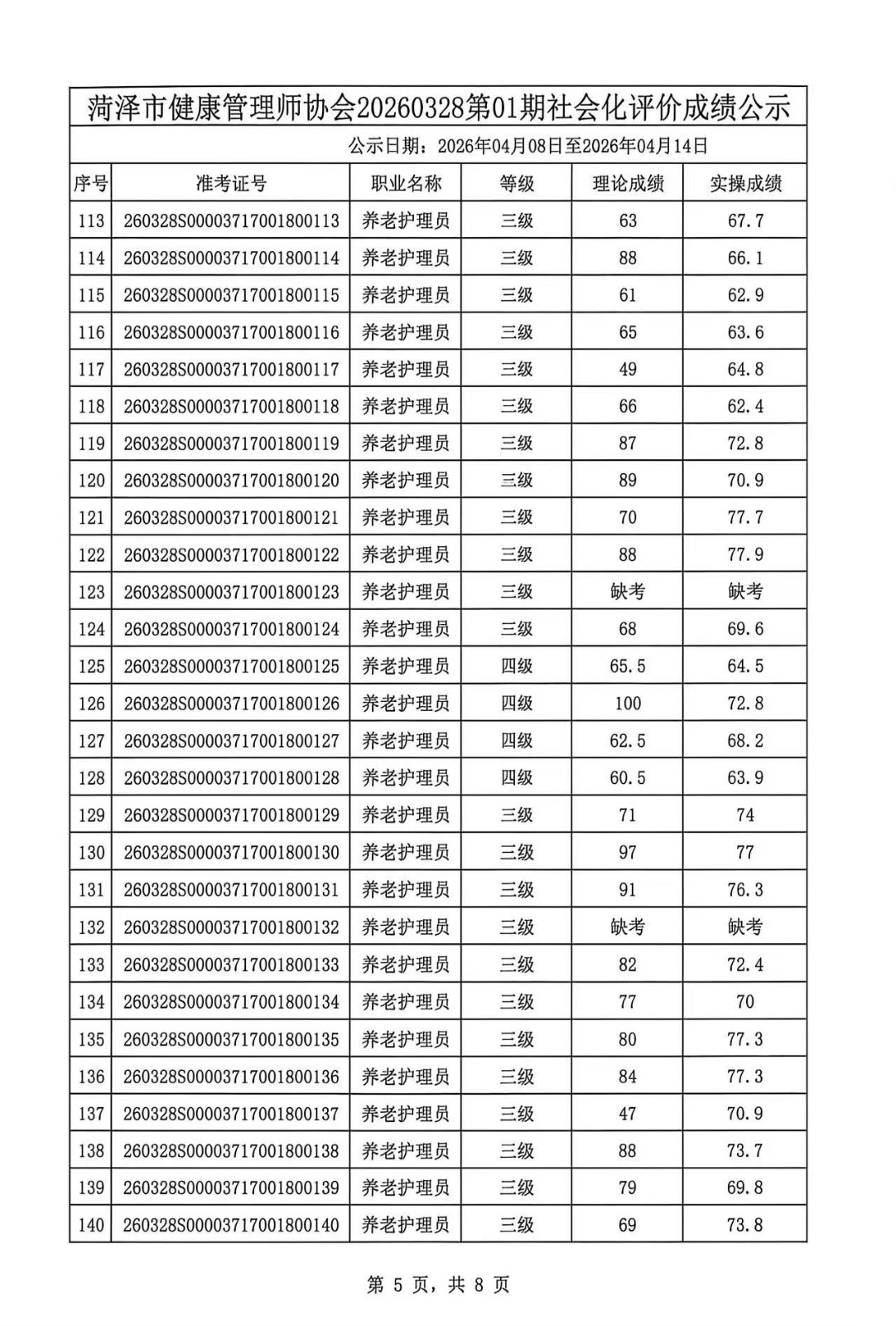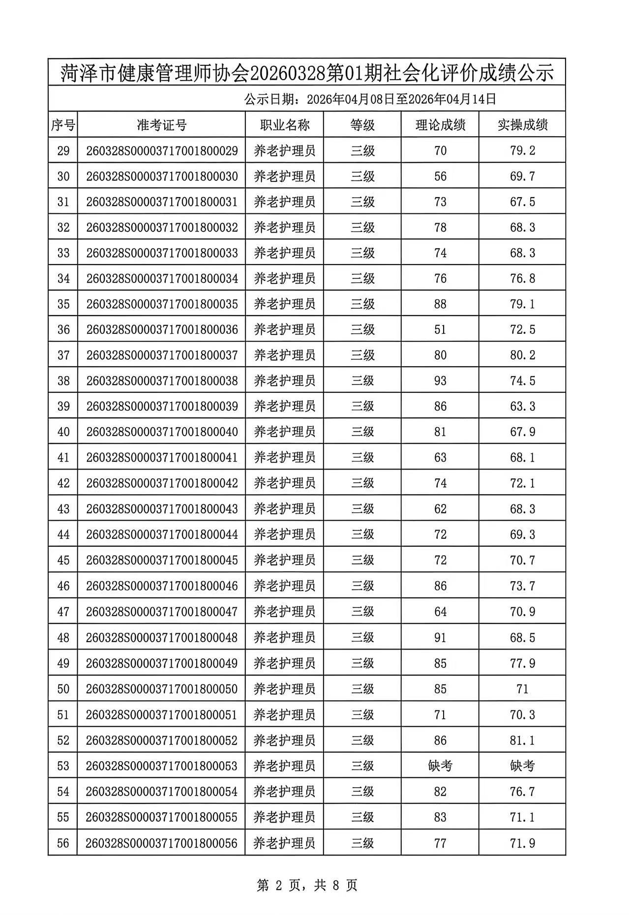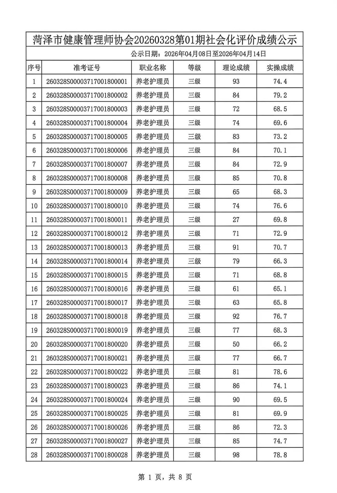 菏泽市健康管理师协会20260328第01期社会化评价成绩公示。